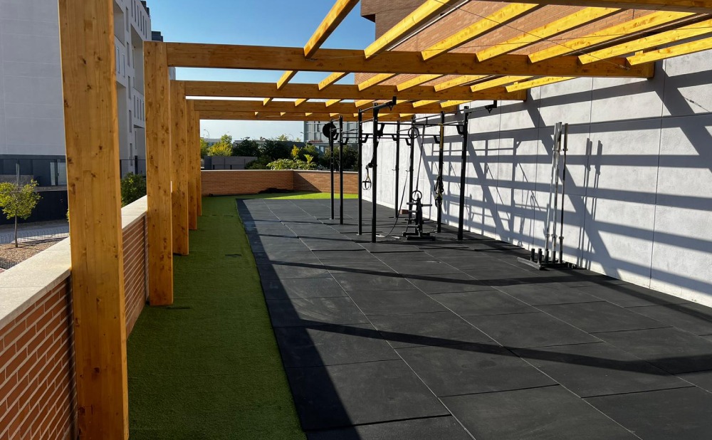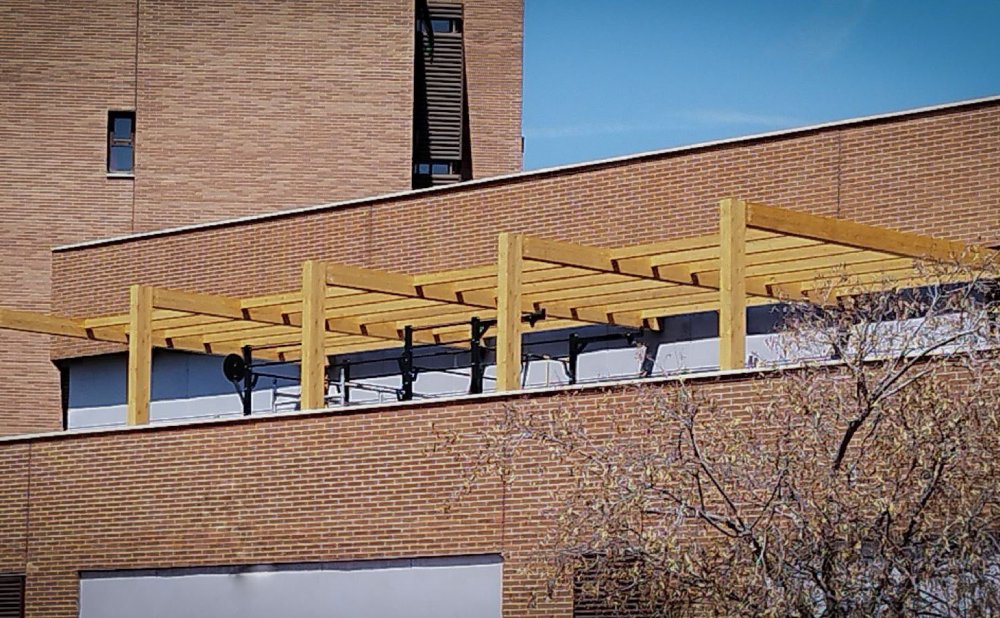 Estructura de madera para pérgola sobre terraza de edificio dotacional deportivo: Gimnasio. El promotor nos encarga una solución para sombrear y proteger del agua de parte de la terraza del edificio de gimnasio para realizar actividades al aire libre. Se propone una solución con estructura de madera laminada encolada, ejecutada con anclajes de aluminio estructural, y cubierta de policarbonato.