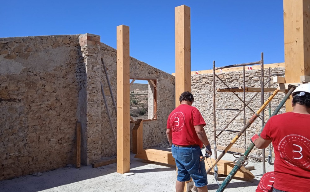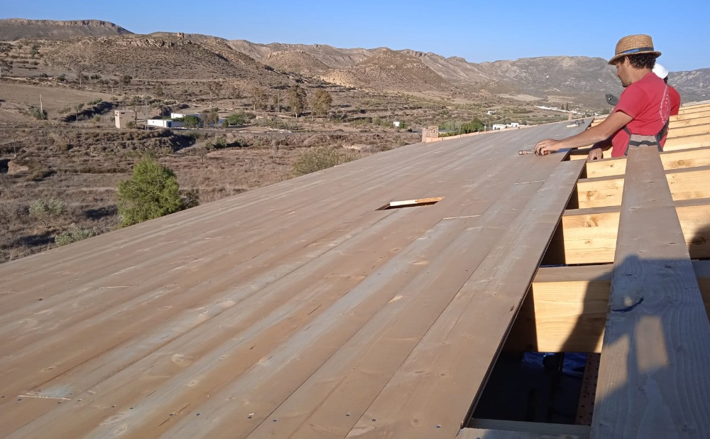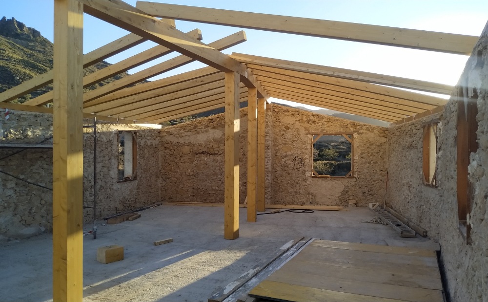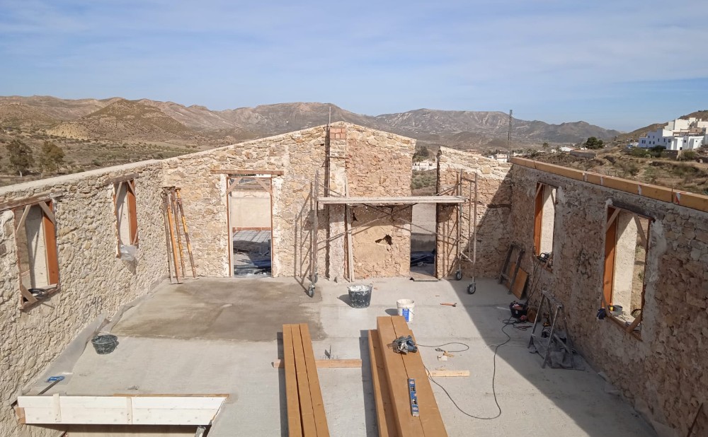 Rehabilitación de antiguo cortijo en Almería. Manteniendo los muros de piedra, se procede a la reestructuración general del edificio, ejecutando un forjado en planta primera y una cubierta de pares apoyados en los muros existentes y en la cumbrera de madera.
