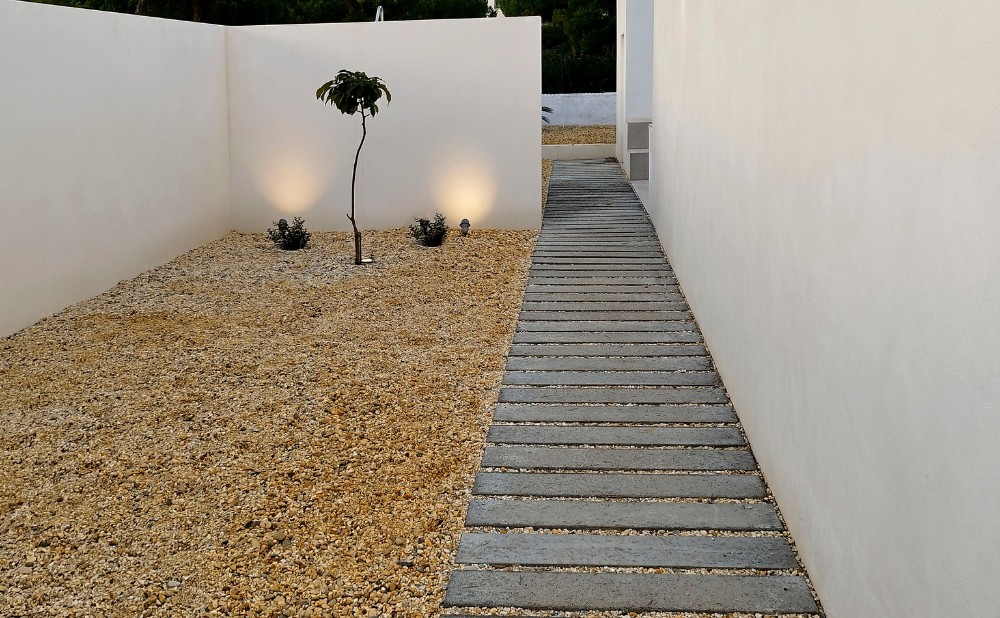 Muros de carga, grava decorativa, revestimiento monocapa.